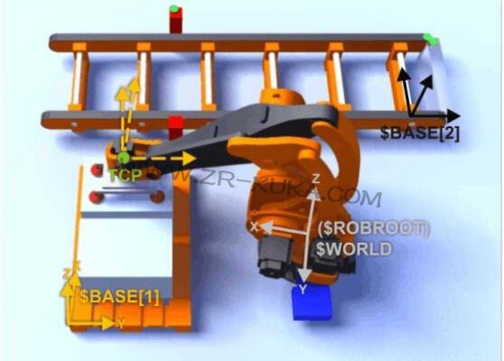 機器人的工具可以根據基坐標系的坐標方向運動。基坐標系可以被單個測量,并可以經常沿工件邊緣、工件支座或者貨盤調整姿態。由此可以進行舒適的手動移動!